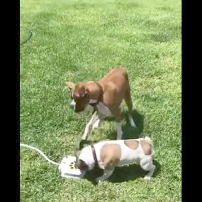 A dog catches water in his mouth in the backyard while a bulldog dog pushes a foot switch that shoots the water in to the air.