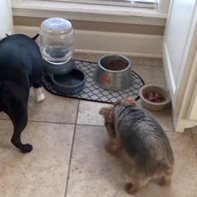 A yorkie dog barks at a second dog when the yorkie wants to switch bowls of food. The second dog moves immediately both times the yorkie dog barks.