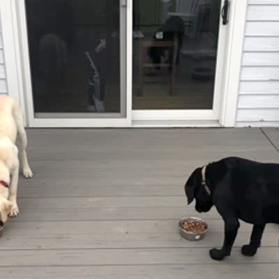 A black Labrador dog and a yellow Labrador eat bowls of food and repeatedly switch bowls.