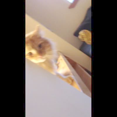 A fluffy orange cat stands opposite the person behind the camera and pokes his head out from behind a pole. The camera switches to the other side of the pole and the cat follows suit, quickly shifting back and forth repeatedly.