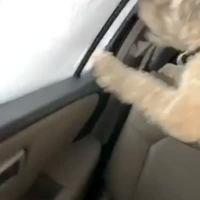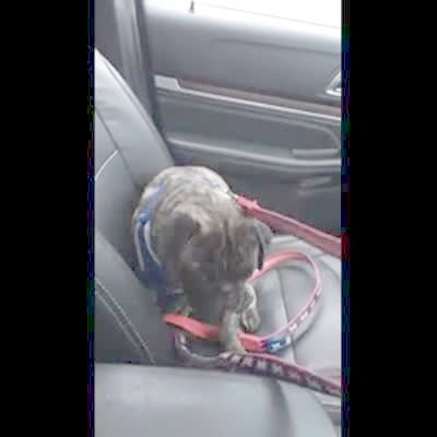 A woman tries to get her Pug dog out of her car but he sits in the seat on the opposite side from her, so she goes to the other side to grab him but he switches to the far side again.