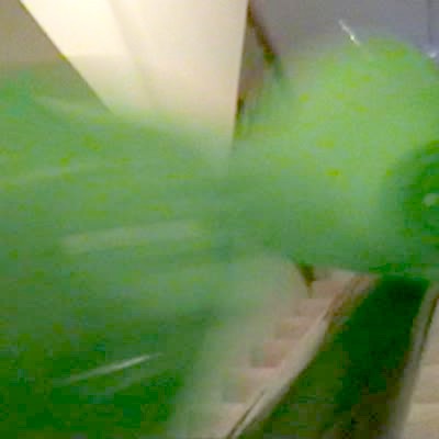 Boy yells "fire in the hole" at top of the stairs & slides a stack of cups down the step railing. Cups hit a light switch at the bottom of the steps & fall off like dominoes. Boy does this 3 times.