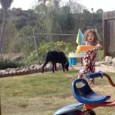 A man tosses a ball to a tot girl outdoors, who swings a toy baseball bat and hits it. The girl switches place with a boy who hits the ball directly into the camera.