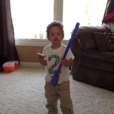 A tot boy holds a toy golf club indoors and when his dad asks what's in his hand, he opens his hand to look at it. His dad asks what's in the other hand and the boy switches which hand the golf club is in to look at his other hand because he doesn't understand what his dad is asking about.