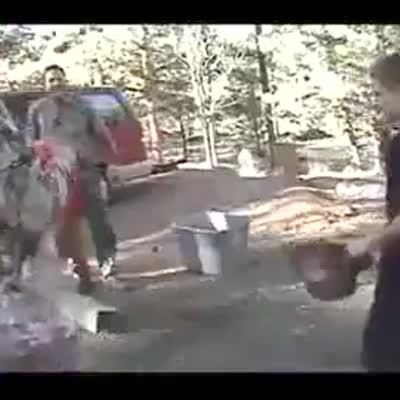 A man throws a log behind his back into a plastic bucket, convinces his friend to try, then switches to bucket with a shovel, hitting his friend in the crotch.