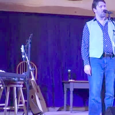 A man sings on stage at a concert. He receives a phone call in the middle of his performance and answers the phone and carries on a conversation as he continues to follow along with the song.