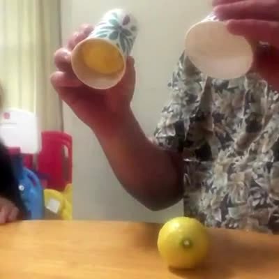 A man does the Vanishing Ball Trick on his tot daughter with two lemons, and he makes it look like one lemons switches from cup to cup and the tot girl gets excited. AA: The Vanishing Ball Trick.