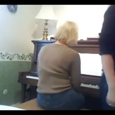 Mom and daughter sit at piano and then switch places. Daughter falls out of frame and Mom laughs uncontrollably. Both are women.
