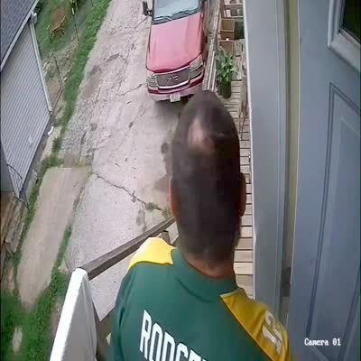 A woman trips and falls while she carries several bags and packages up to the front door of a house, then swears repeatedly. Security footage.