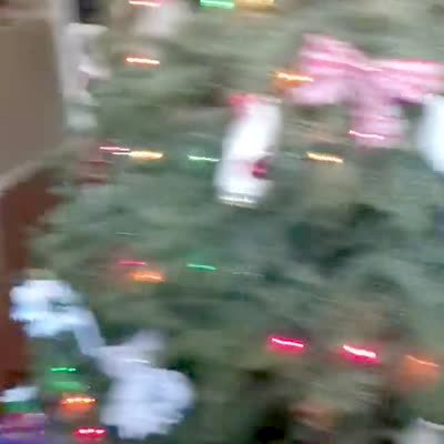 A man opens a Christmas present in the living room. At first he yells profanities and runs away. Then he looks into the package again and reveals his mom. They hug and he cries.