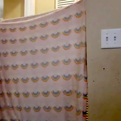 A tot girl and a young boy quickly switch places when they hide behind a blanket in the living room as their family cheers.