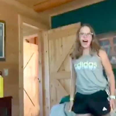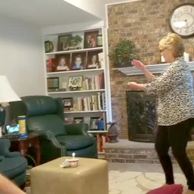 A grandma dances in a living room then loses her balance and face plants after she lets her hair down.