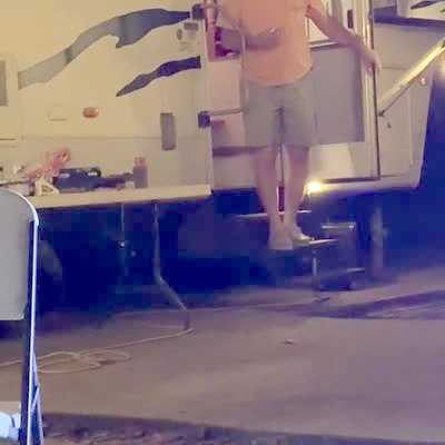 A man exits a camper at a campground and another man emerges from under the camper and hisses at him. The first man jumps. Social media video. Music rights not cleared.
