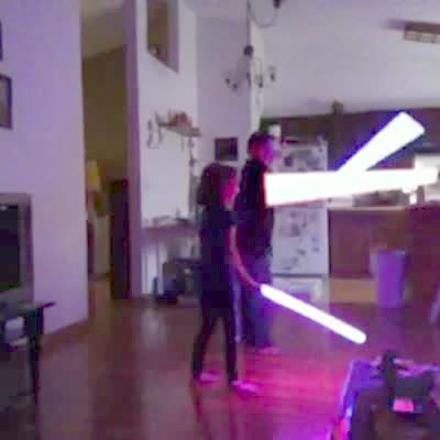 A man has a light saber fight with toy light up lightsaber Star Wars swords with a boy and a young girl in a living room. The boy gently falls, pretending to be dead. The girl smacks the man hard in the face with her light saber. He falls and she laughs. Dark room.