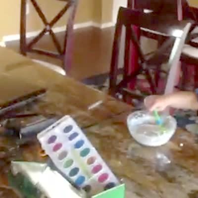 A tot boy is having a sword fight with dad while trying to eat his cereal.