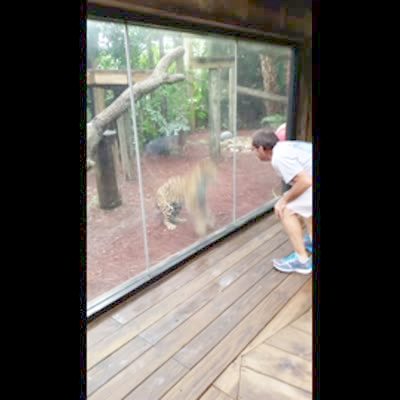 A man jumps synchronized jumps with a jaguar at the zoo.