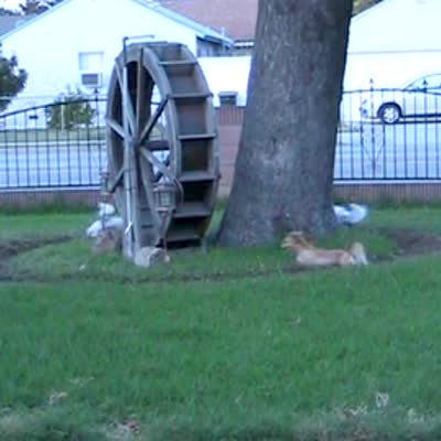 3 small dogs run around a tree in the yard, 2 run in one direction and 1 runs in the opposite direction. Looks synchronized. Funny visual. Long for edit.