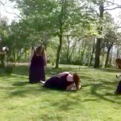 A woman falls while four bridesmaids try to do a leaping pose for a photo.