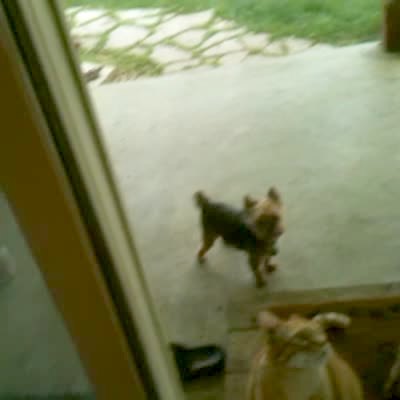 Four yorkie dogs and a cat look through a sliding glass door into a house. The cat paws at the glass door. It jumps up, opens the sliding door with its paw, and the dogs walk through the door. Longer clip.