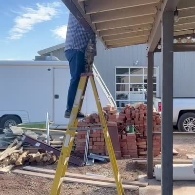 A man on a ladder rescues a black cat from a roof, then a tabby cat climbs up on it immediately after.