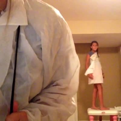 A teen girl dances on a table. Her dad pushes her off and dances on the table and it collapses beneath him.