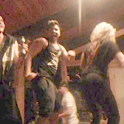 Man in dreadlocks picks up woman in dreadlocks while dancing at a party. Man falls over a table and the table falls on top of him.