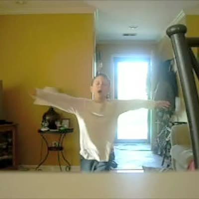 Young boy lip synchs and dances in the living room. He knocks over a side table and lamp and says "Whoopsie!"