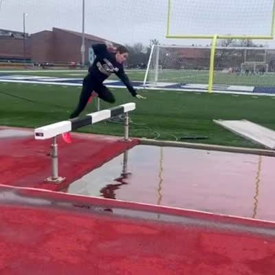 A woman jumps over a track hurdle and falls into a rain puddle. Featured talent cleared only (the woman who falls into the puddle).