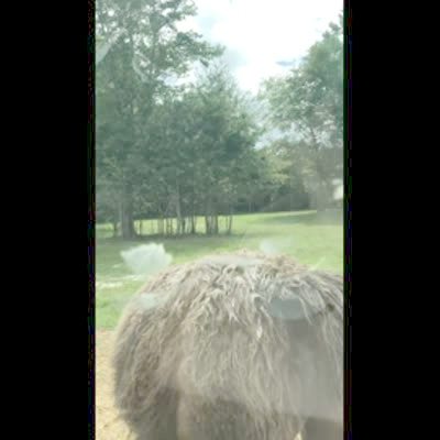 An alpaca walks up to the window of a car at a drive through safari zoo and takes the entire bucket of food from a young boy then walks away as the family laughs