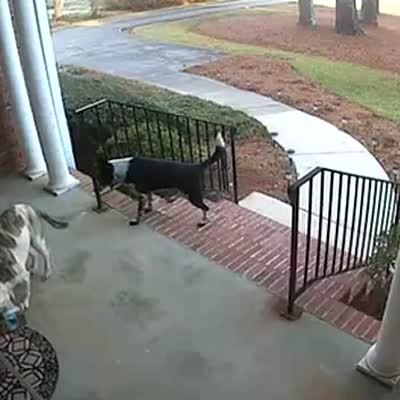 A dog takes a package off a front porch as another dog watches from the yard, then they walk away.