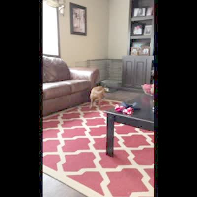 A dog walks around under a small table and gets stuck. He scrambles to get free and takes the table with him while items fall off and break. Security footage.
