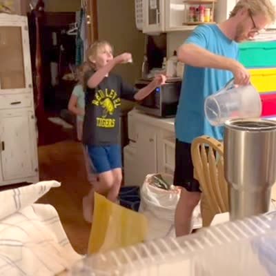A man screams, flails and takes his shirt off after a young boy puts a fake cockroach down the back of his shirt in a kitchen.