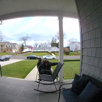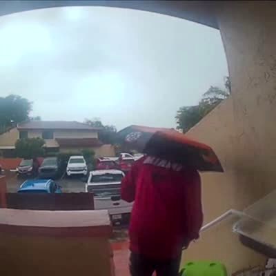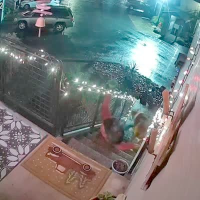 A man takes a whole front porch down with him when he stumbles and falls after he steps out into a rainy yard. Security footage.