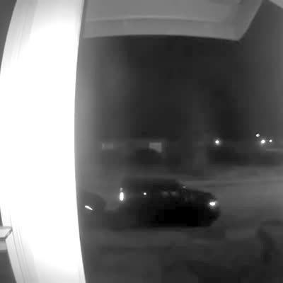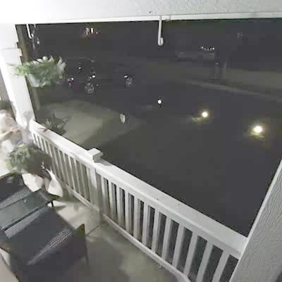 A teen boy takes down a hanging plant and a bird flies out of it. He screams on the front-porch and runs into the house. Security footage. Night. Dark