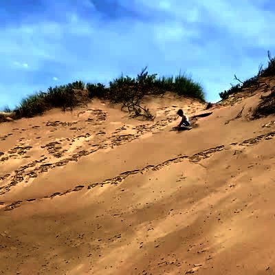A young boy attempts to boogie board down a sandhill, but the board does not go anywhere, and the young boy falls off of it. The wind then takes the board away.