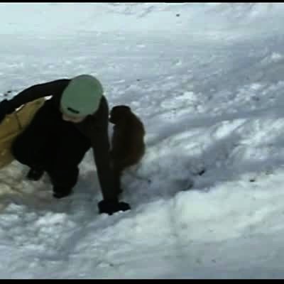 A man exploring a frozen waterfall with his dog slips and falls before sliding down the ice towards the camera.