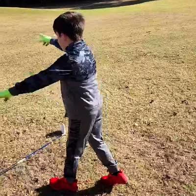 A young boy takes off his jacket outside. Then he swings a golf club at a ball outside. He flips and falls down.