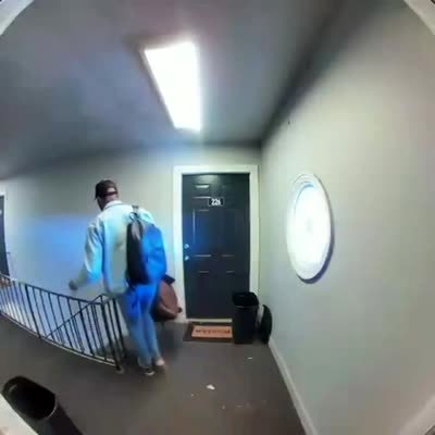 A man takes a tumble down a stairway in an apartment building then says, "damn!" Security footage.