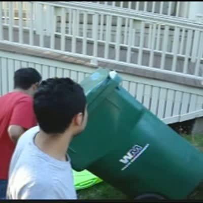 A young boy tries to take out the trash in the driveway, but the bag breaks and spills. Security footage.