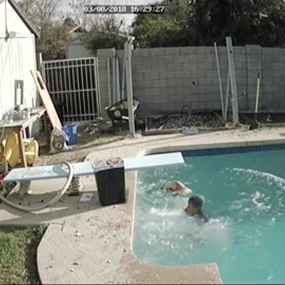 A young boy takes out the garbage and steps over the edge of the pool and falls in then the trash can hits the diving board and trash falls in on top of him. Security camera footage