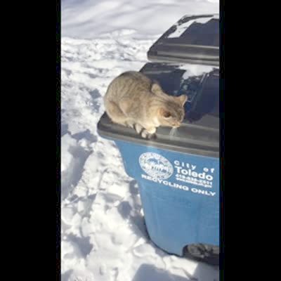 A woman goes out to her driveway and sees a cat on a trash can and repeatedly says "hello" to it, and the cat makes a sound that is similar to "hello."