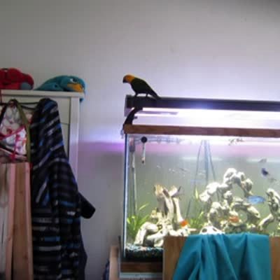 A cat climbs up a board in an attempt to get to a parrot on top of a fish tank when the board falls backwards onto it.