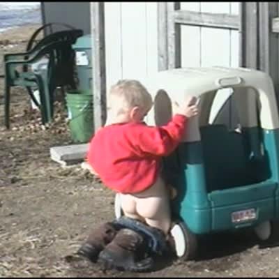 Young boy tries to pee into the gas tank of his toy car. Grandma / senior woman asks what he's doing, boy says he's "Filling up the gas." Kids say.