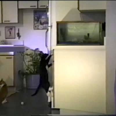 Black kitten tries to swat at an aquarium & falls off of a cabinet. No recovery, no tails, very short. Cat knocks over an un-lit candle. Fish tank.