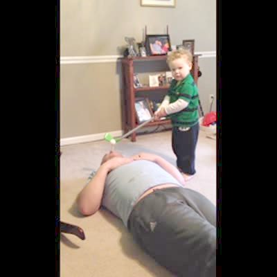 A man lies on the floor with a ball and tee in his mouth before his tot son hits him over the head with a toy golf club.