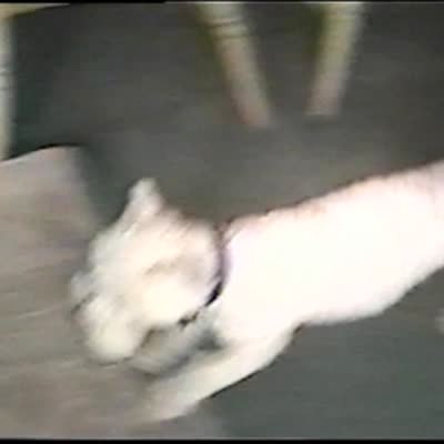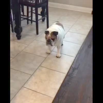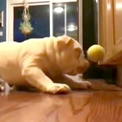 An English bulldog puppy dog crashes face first into a kitchen cabinet as he chases a tennis ball. Slo-mo.