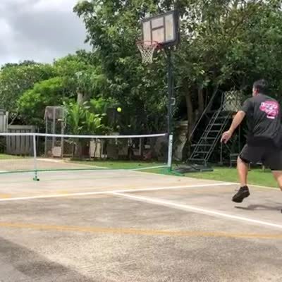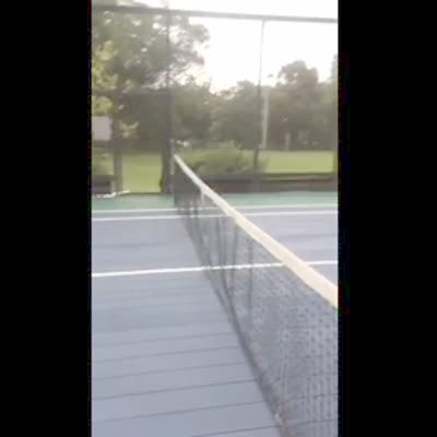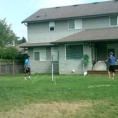 Two men play tennis in the yard and one of them trips and falls into the net. Music rights not cleared.
