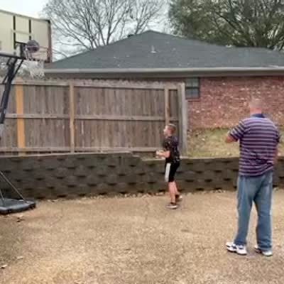 A young boy throws a tennis ball at a basketball hoop to dislodge a basketball but it bounces off the backboard and hits his father in the groin.