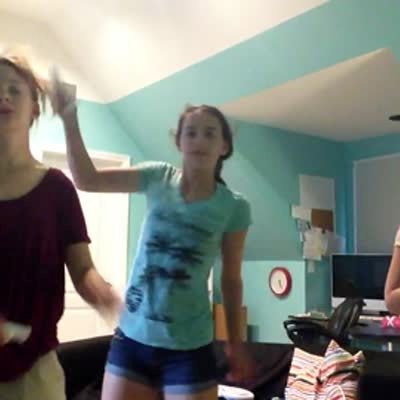 Three teenage girls play a tennis video game with Wii. The game says "15 points" after one girl accidentally hits her friend in the head and knocks her down.