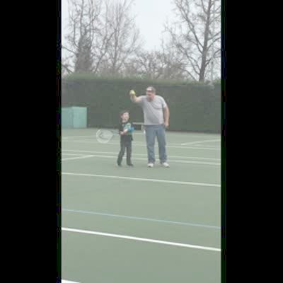 A man teaches a boy how to play tennis and gets hit in the groin.